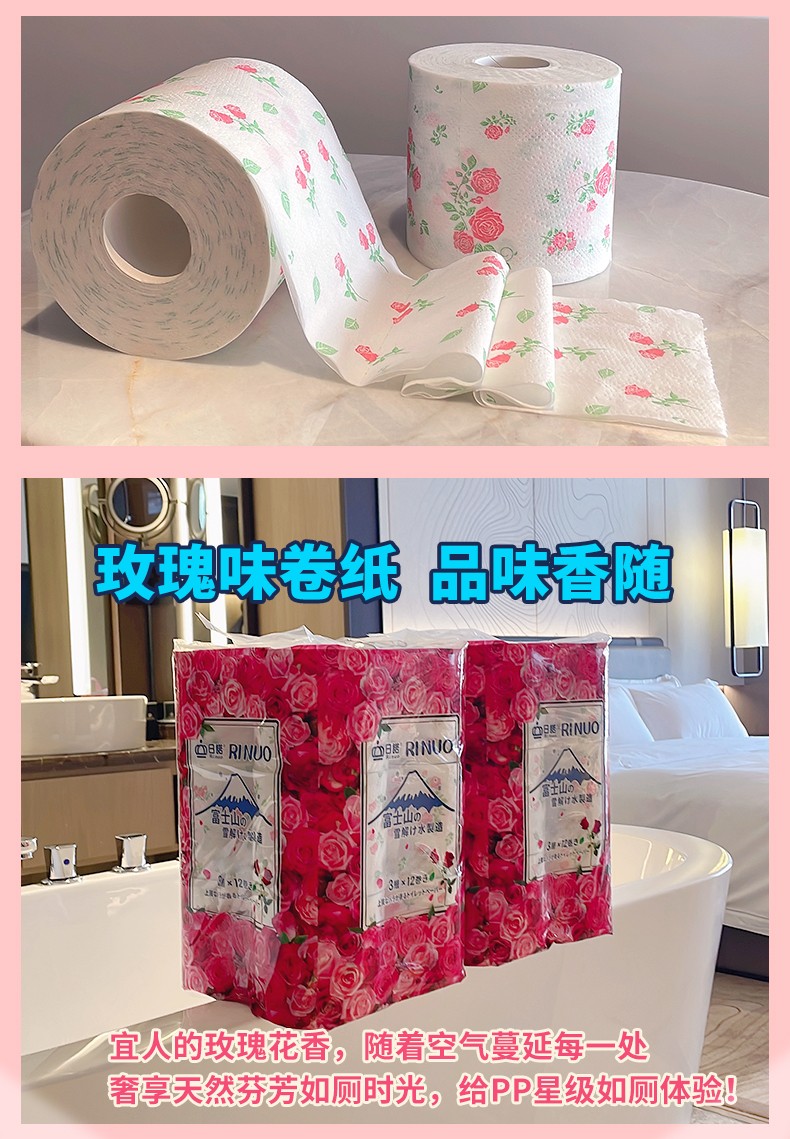 日諾日本進(jìn)口玫瑰花香卷筒紙印花衛(wèi)生紙可溶水溶廁紙有芯卷紙1提